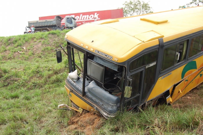 O ônibus foi jogado no barranco Foto:Portal Infonetno caso desse motorista ele saiu da pista dele e se jogou na frente do ônibus”, observa José Vieira, ressaltando que cerca de 10 passageiros ficaram feridos.Sem cinto